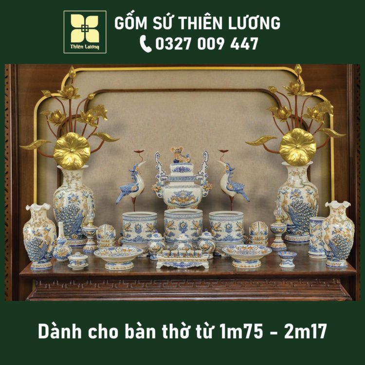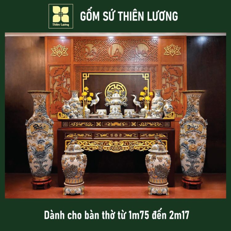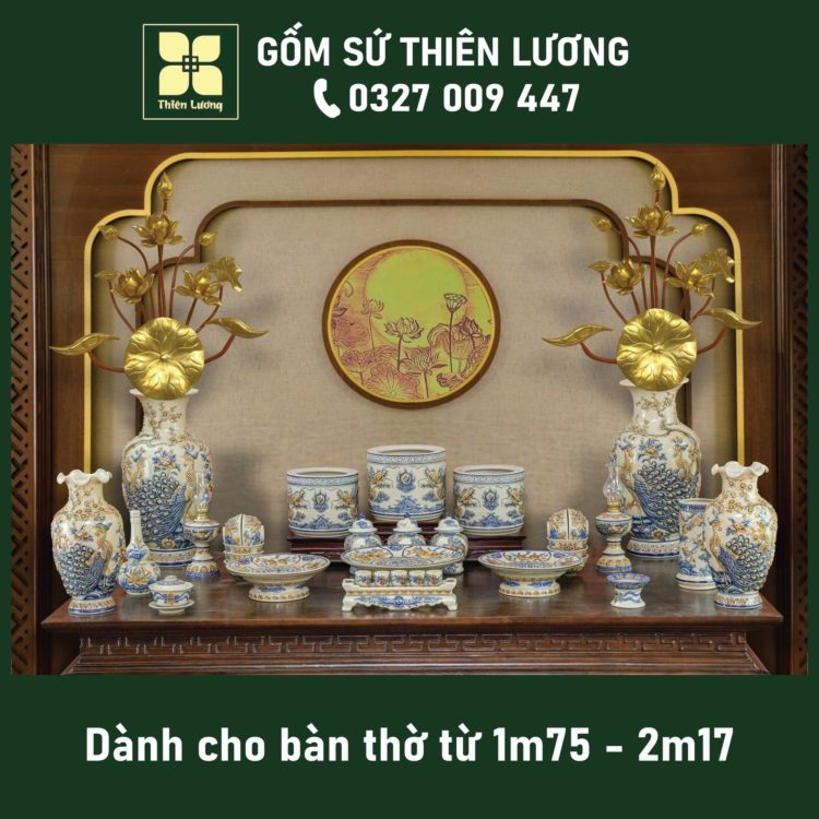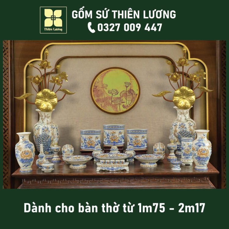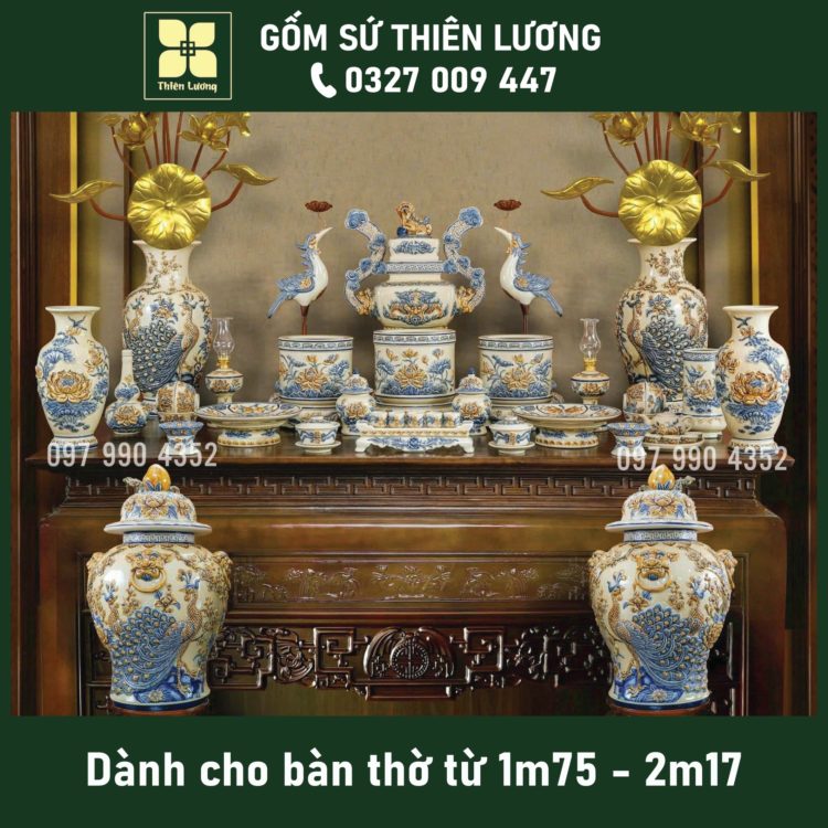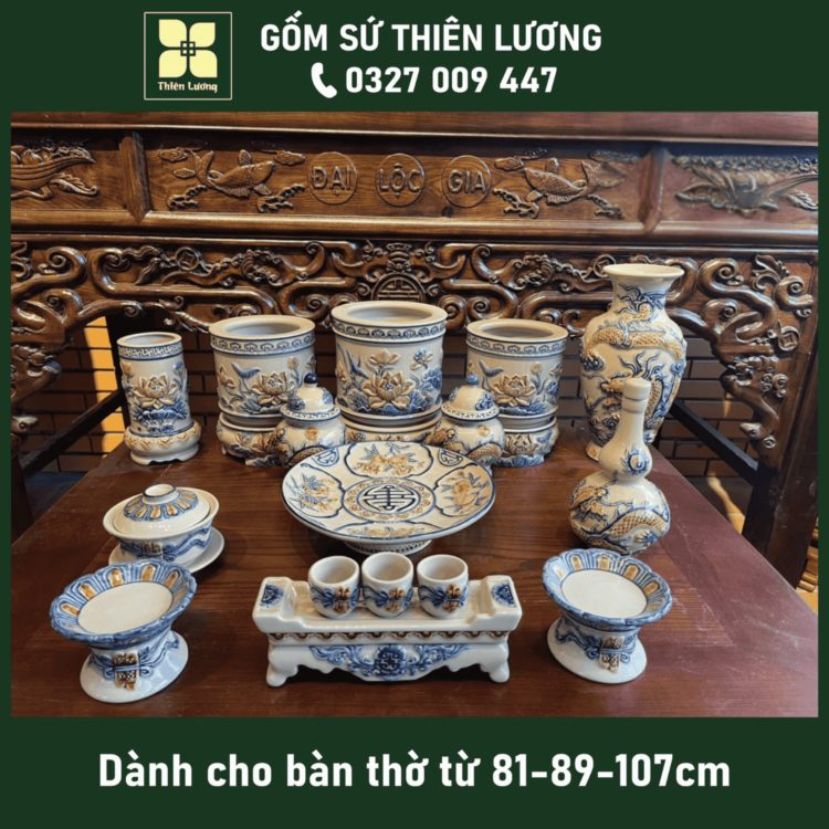 Bộ đồ thờ men lam Huế vẽ vàng 24K cho ban thờ 61-69-81cm – TLBT0018