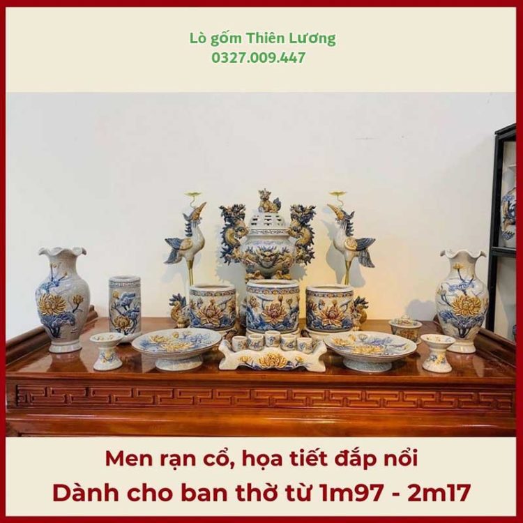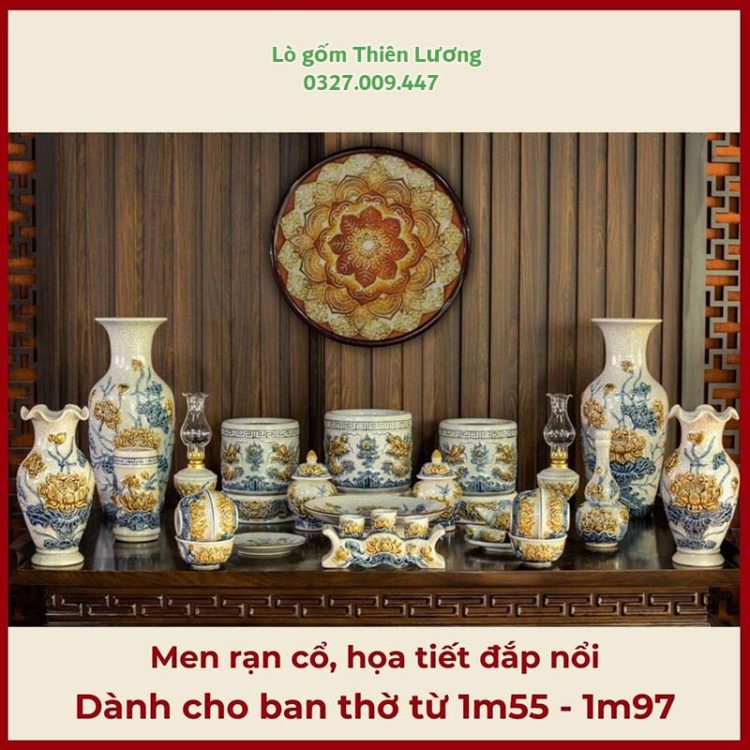 Bộ đồ thờ men rạn đắp nổi Sen cho ban thờ từ 1m75-2m17 – TLBT0067