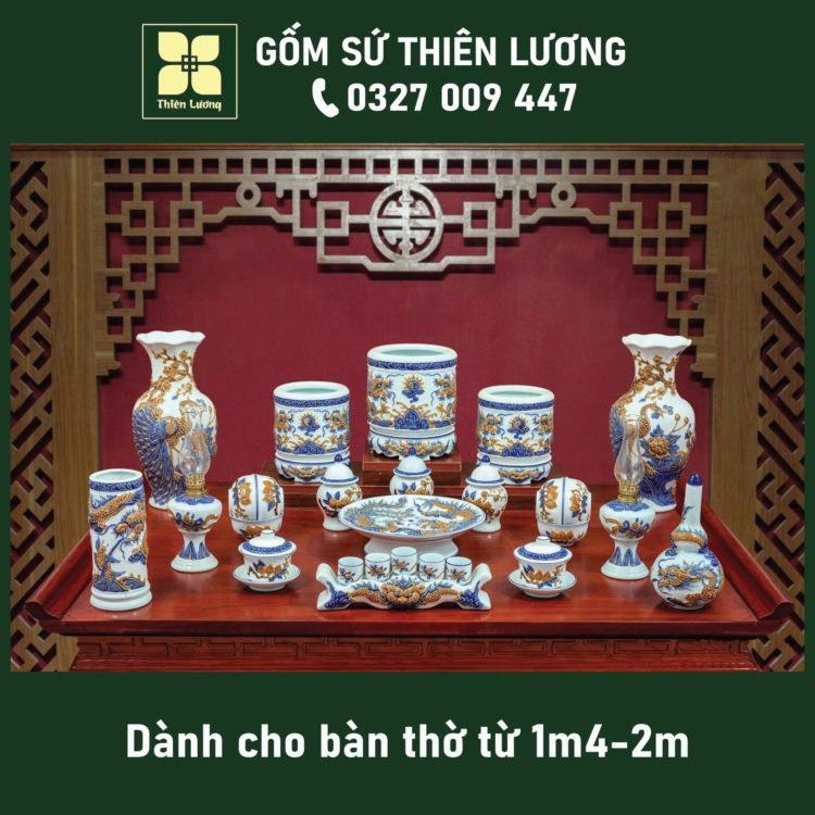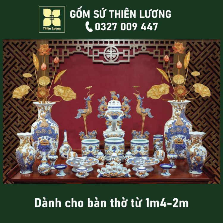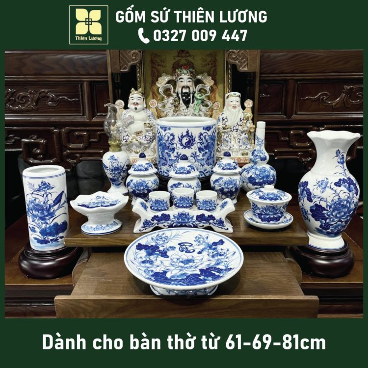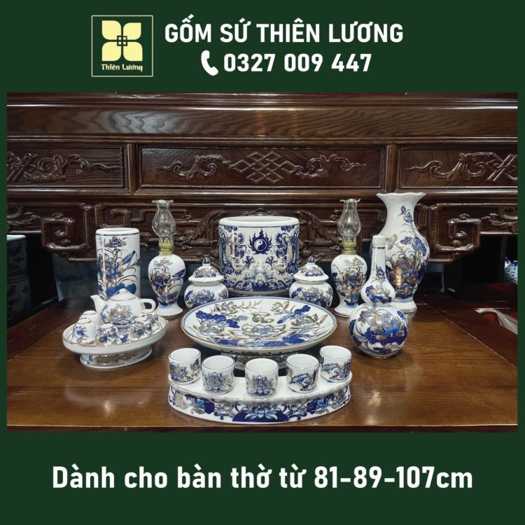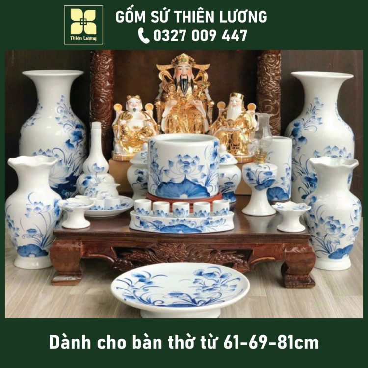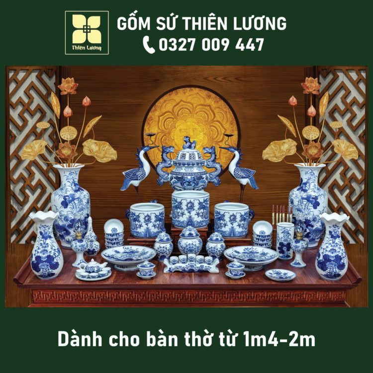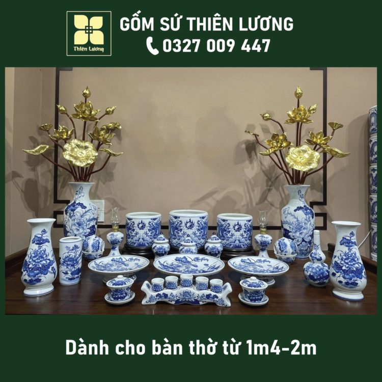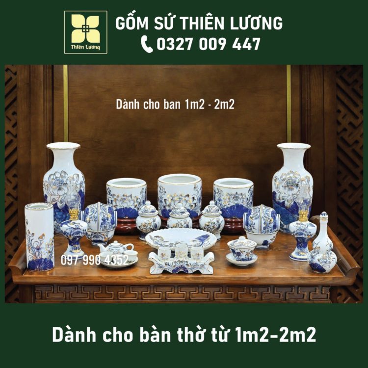 Bộ bát hương thờ gia tiên men lam sen chàm vẽ vàng 24k cho ban dài 1m2-2m2 bảo hành trọn đời