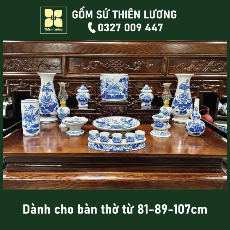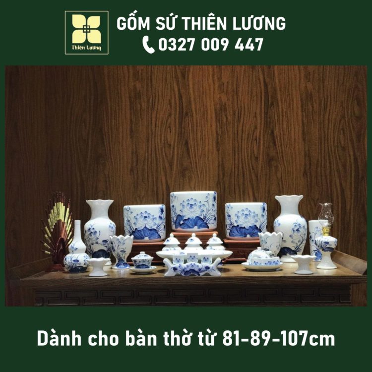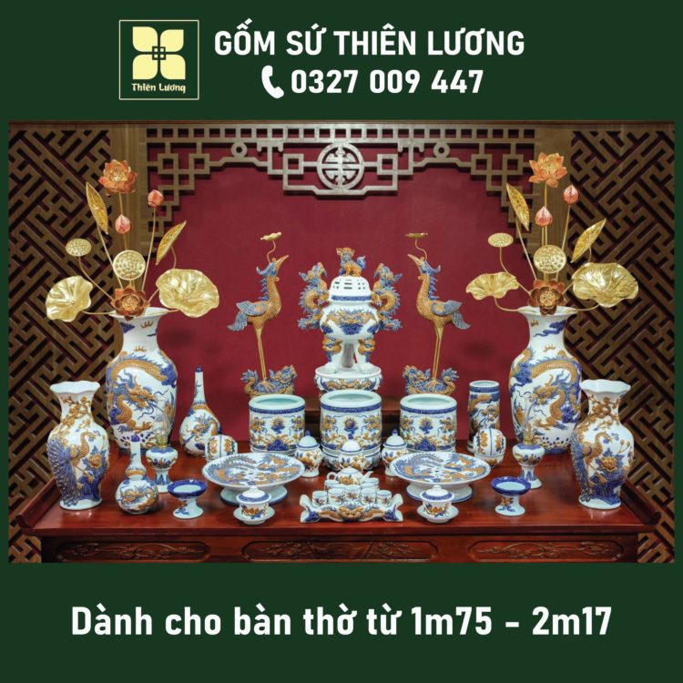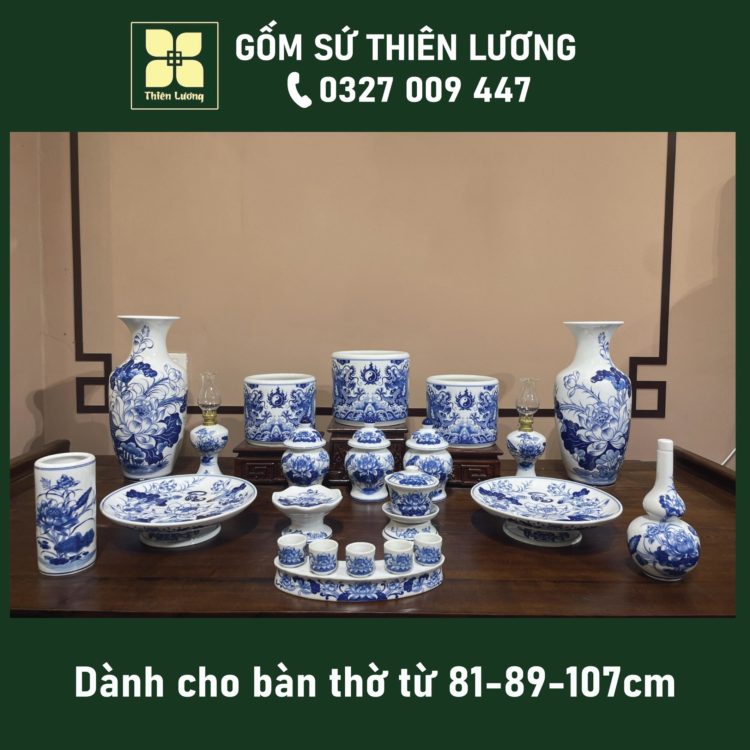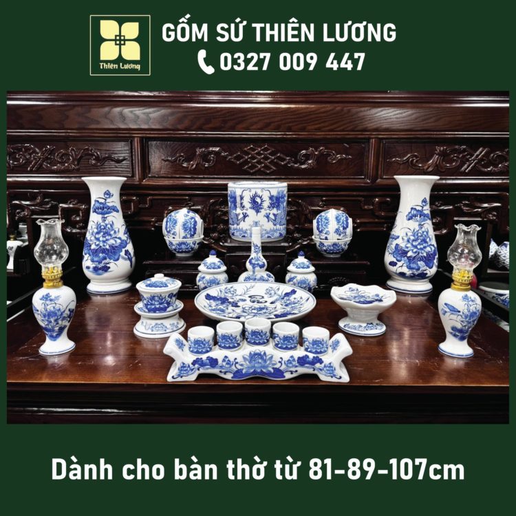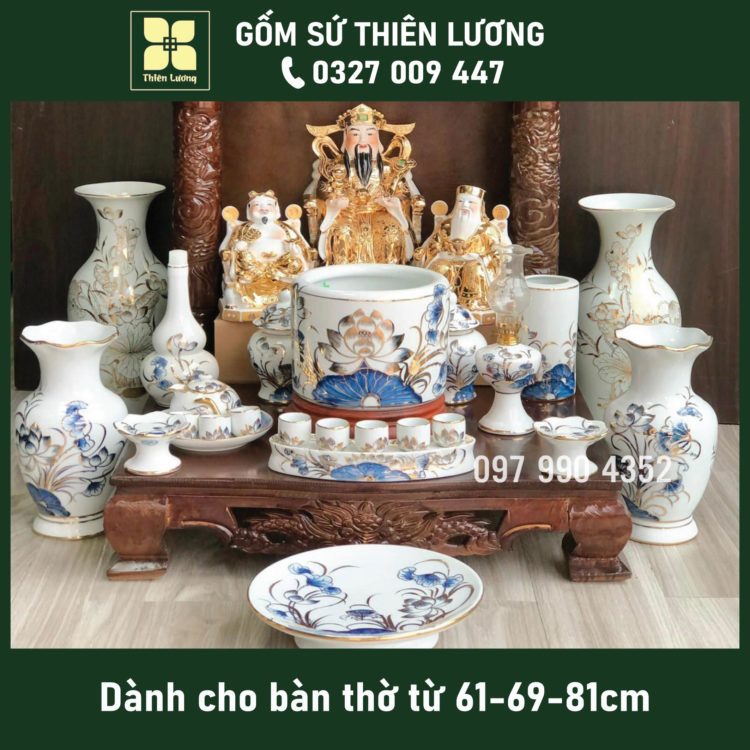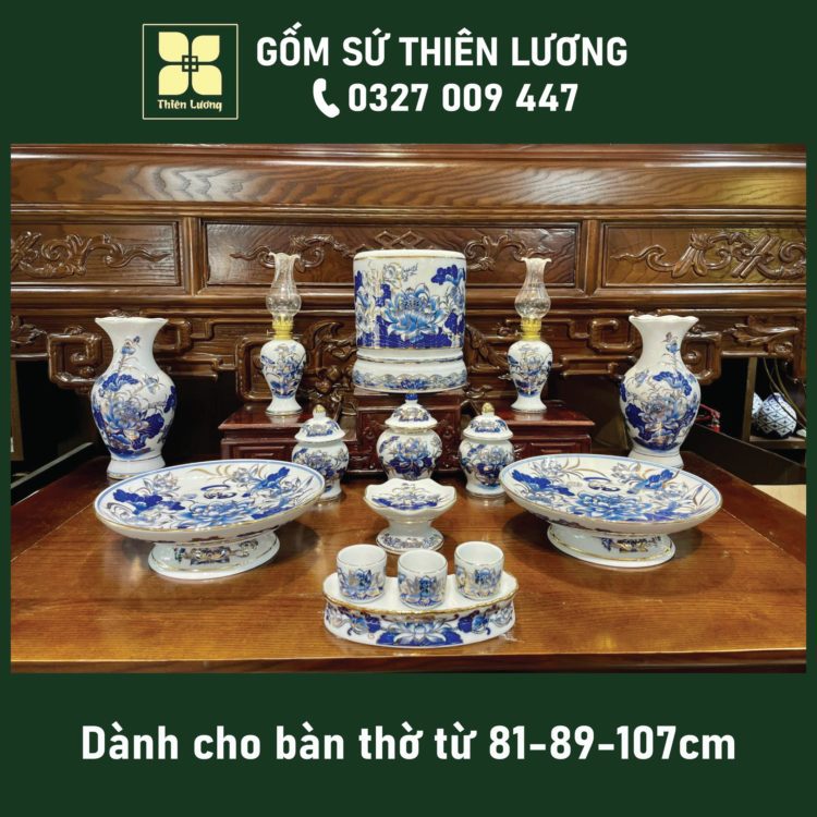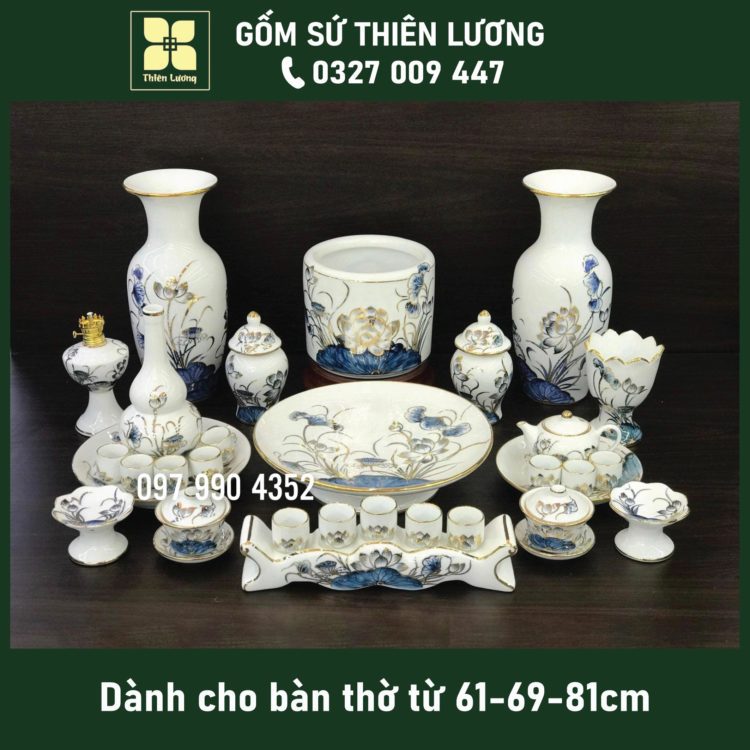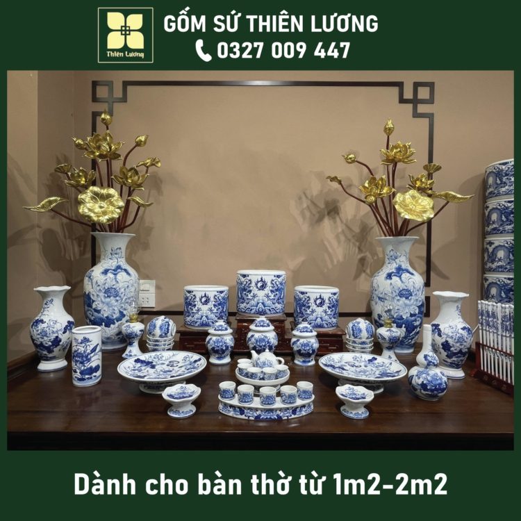Bộ bát hương thờ gia tiên men lam sen chàm vẽ vàng 24k cho ban dài 1m2-2m2 bảo hành trọn đời