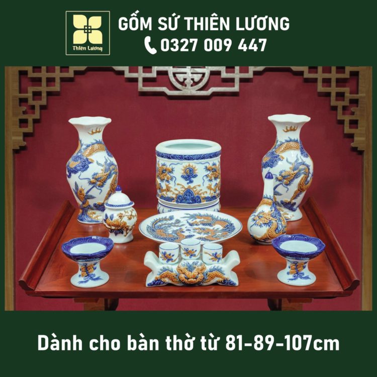 Bộ bát hương thờ gia tiên Bát Tràng men lam ngọc đắp nổi họa tiết Rồng Phượng ban thờ 1m97 – 2m17