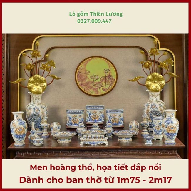 Để không gian thờ trở nên trang trọng và mang đúng phong thủy, việc lựa chọn bộ đồ thờ phù hợp là yếu tố rất quan trọng. Bộ đồ thờ men hoàng thổ đắp nổi cho ban thờ 1m75-2m17 TLBT0091 chính là sự kết hợp hài hòa giữa nghệ thuật gốm sứ thủ công tinh xảo và yếu tố tâm linh thuần Việt.