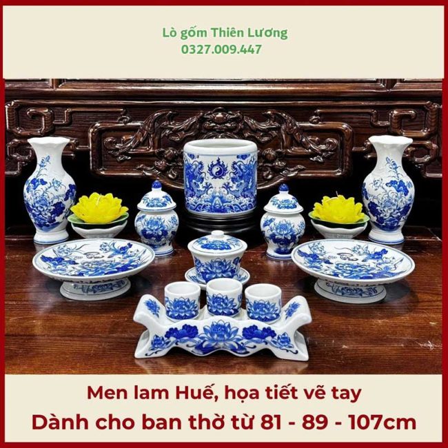 - Tên sản phẩm: Bộ đồ thờ men lam Huế 11 chi tiết họa tiết vẽ tay Sen Rồng cao cấp – TLBT0033