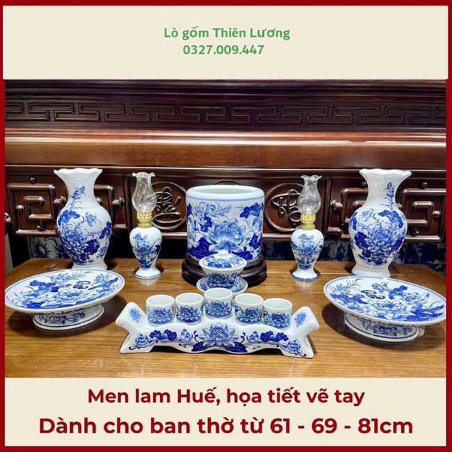 Lớp men lam Huế có sắc xanh dịu nhẹ, hơi trầm, tạo cảm giác cổ kính, sâu lắng và trang nghiêm. Men được nung ở nhiệt độ cao giúp sản phẩm có độ cứng cao, màu sắc bền bỉ, dễ dàng vệ sinh và giữ được vẻ đẹp lâu dài theo thời gian. Đặc biệt, các họa tiết vẽ tay tỉ mỉ rất có chiều sâu về nghệ thuật và đây chính là điểm nhấn chính cho không gian thờ tự.
