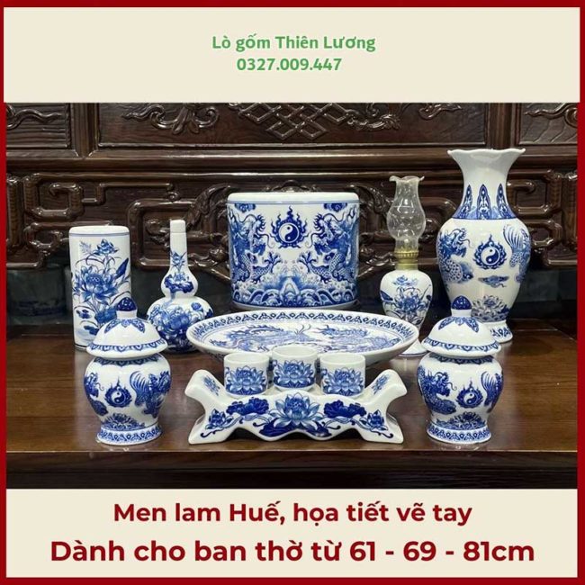 Điểm nổi bật của bộ sản phẩm là lớp men lam Huế đặc trưng với gam màu xanh lam trang nhã, cổ điển, tạo nên chiều sâu và vẻ đẹp trầm mặc cho không gian thờ. Men được nung ở nhiệt độ cao, giúp sản phẩm có độ bền chắc, chống bong tróc, dễ lau chùi và giữ màu sắc bền bỉ lâu dài theo năm tháng.