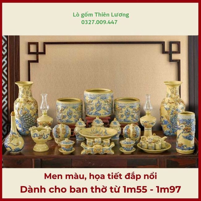 1. Thông tin sản phẩm Bộ đồ thờ men màu vàng đắp nổi cho ban thờ 1m55-1m97 – TLBT0089