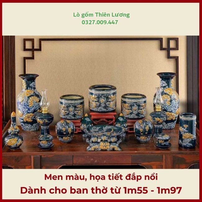 Việc lựa chọn bộ đồ thờ phù hợp với kích thước bàn thờ không chỉ giúp không gian trở nên cân đối mà còn góp phần thể hiện sự thành kính của gia chủ. Bộ đồ thờ men màu xanh đắp nổi cho ban thờ 1m55-1m97 là lựa chọn hoàn hảo mang giá trị truyền thống, thẩm mỹ và phong thủy sâu sắc.