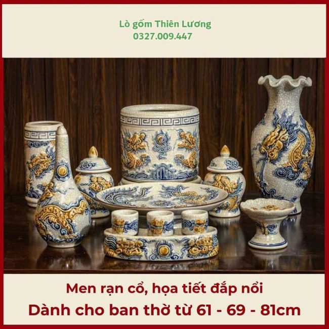 - Tên sản phẩm: Bộ đồ thờ men rạn đắp nổi họa tiết Rồng 9 chi tiết cao cấp – TLBT0042
