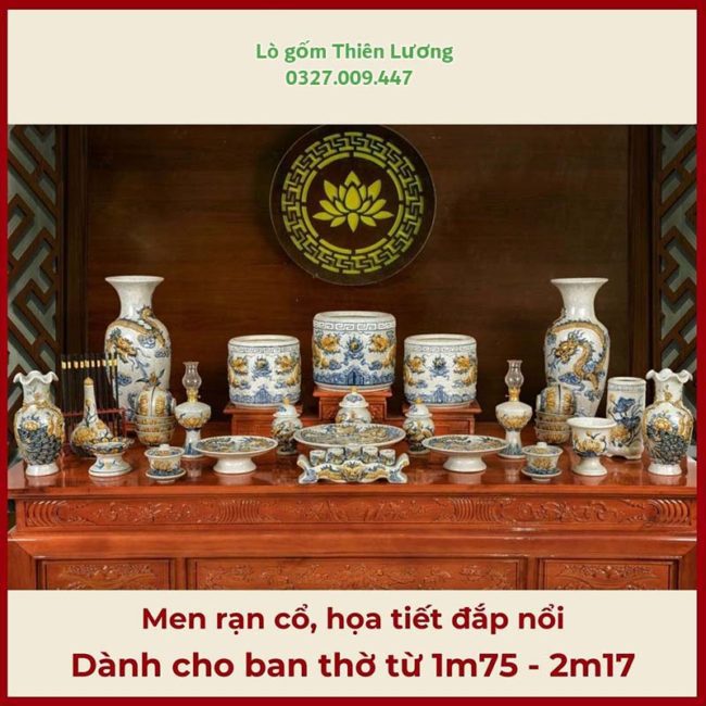 Bộ đồ thờ men rạn đắp nổi họa tiết Rồng của gốm sứ Bát Tràng là lựa chọn lý tưởng để dành riêng cho ban thờ kích thước 1m75 - 2m17, thể hiện sự tôn nghiêm không gian thờ tự và chiêu tài, giữ lộc cho gia đình. Sản phẩm có độ bền bỉ vượt trội, không bong tróc, dễ lau chùi và rất phù hợp với khí hậu nóng ẩm của Việt Nam. Ngoài ra, men rạn cổ còn giúp tôn lên vẻ linh thiêng và uy nghi cho bộ đồ thờ khi đặt trên ban thờ lớn.