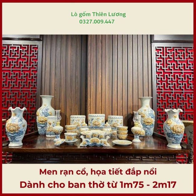 Với những bàn thờ kích thước lớn từ 1m75 đến 2m17, việc lựa chọn một bộ đồ thờ đầy đủ, cân đối và chuẩn phong thủy là điều đặc biệt quan trọng. Bộ đồ thờ men rạn đắp nổi họa tiết Sen màu vàng xanh 23 chi tiết của gốm sứ Bát Tràng chính là lựa chọn lý tưởng cho không gian thờ cúng chuẩn mực và đậm chất truyền thống.