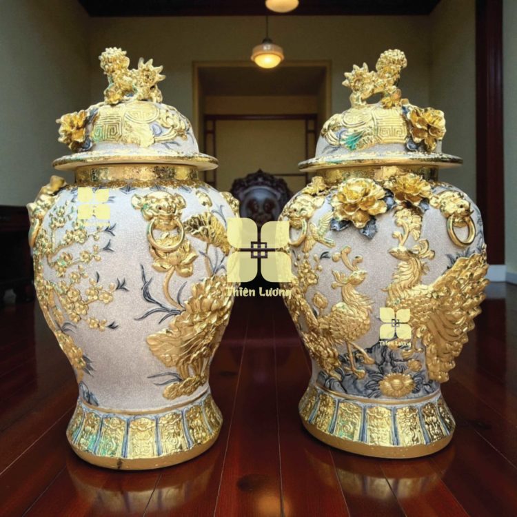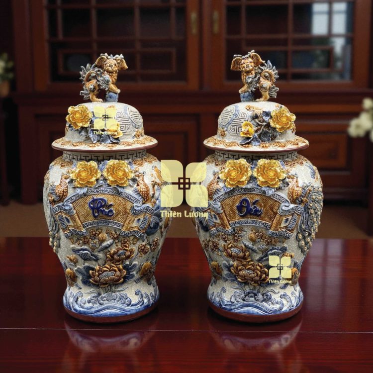 Cặp lộc bình men nổi Tùng – Cúc – Trúc – Mai được chế tác thủ công trên nền gốm cao cấp, nổi bật với kỹ thuật đắp nổi 3D tinh xảo. Các họa tiết Tứ Quý được thể hiện rõ chiều sâu, có độ nổi chạm tay cảm nhận được, mang lại vẻ đẹp sang trọng và đậm chất nghệ thuật truyền thống.